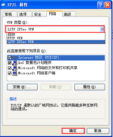 第十步,点击上方“网络”选项卡,下拉选项中选择“L2TP IPSec”,点“确定”;
