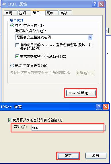 第十一步,点击上方“安全”选项卡,点击“IPSec 设置”,勾选“使用预共享的密钥作身份验证”,并输入图片中的密钥,点击“确定”;