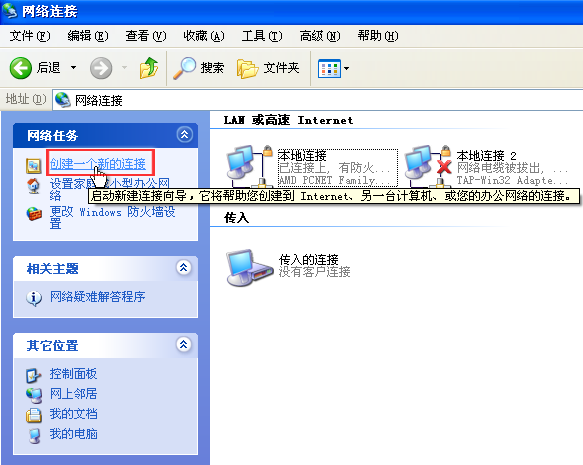 第二步,在网络连接页面,点击“创建一个新的连接”,点击下一步;