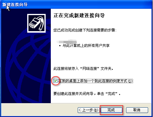 第八步,勾选“在我的桌面上添加一个到此连接的快捷方式”,方便以后直接从桌面打开进行使用,点击“完成”;