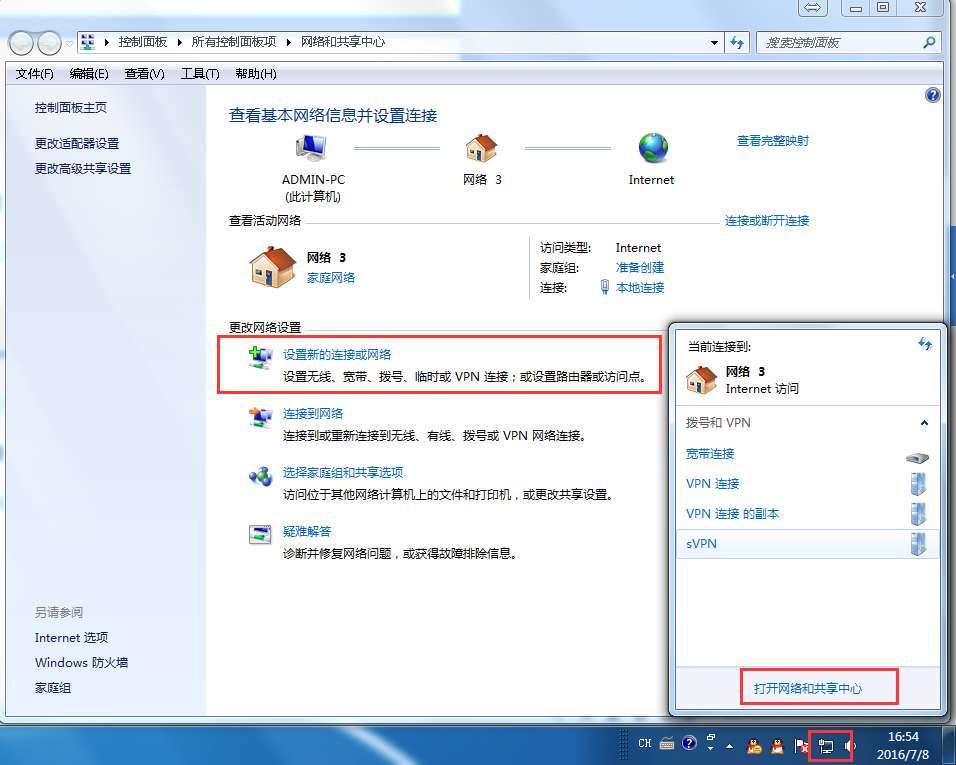 1、打开你的 网络和共享中心,找到设置 新的连接或网络 , 点击进入