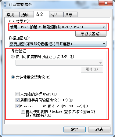 6.打开配置框。点击安全,在这里你可以选择动态IP加速器类型L2TP/IPSEC,注意在数据加密选项,选择需要加密,点击属性“安全”选项卡,将类型设置为“使用 IPsec 的第 2 层隧道协议(L2TP/IPsec)”。然后点击下面的“高级设置”,在弹出窗口中选中“使用预共享的密钥作身份验证”,然后输入图片中的密钥动态IP加速器(注意是小写)。